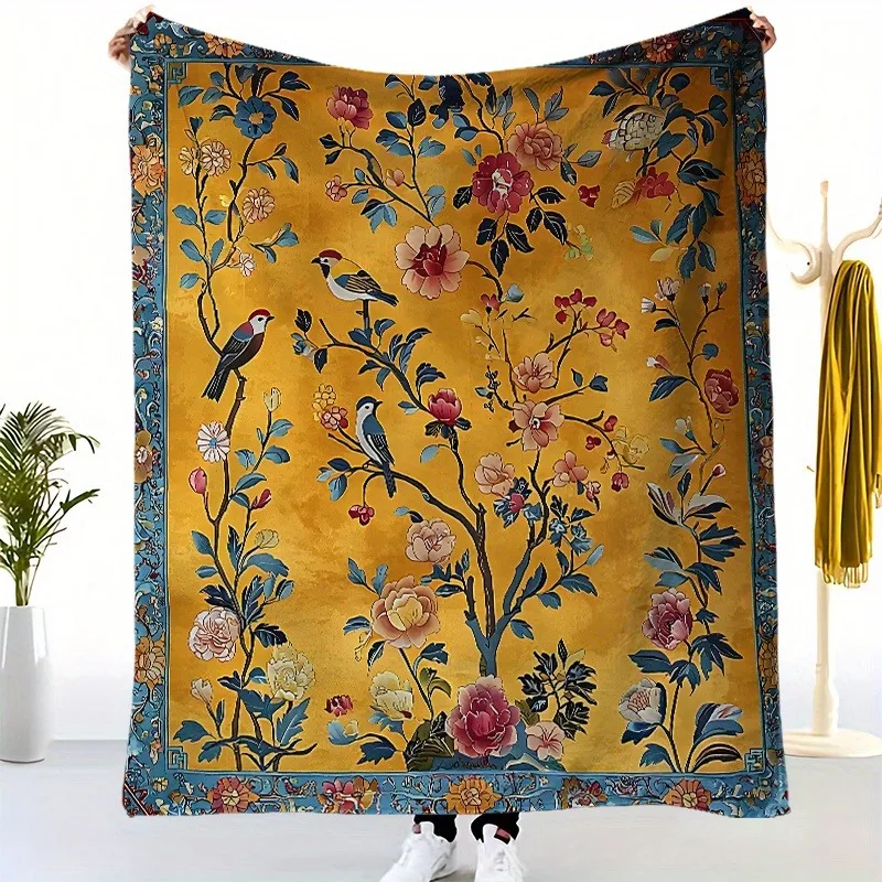 Creative Flower Tree & Bird Pattern Flannel Velvet Blanket – Warm, Soft Plush Throw for Office Napping & Home Use